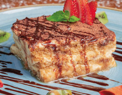 Tradicional receta italiana de la casa elaborada artesanalmente con bizcocho, café, licor de café, cacao y queso.