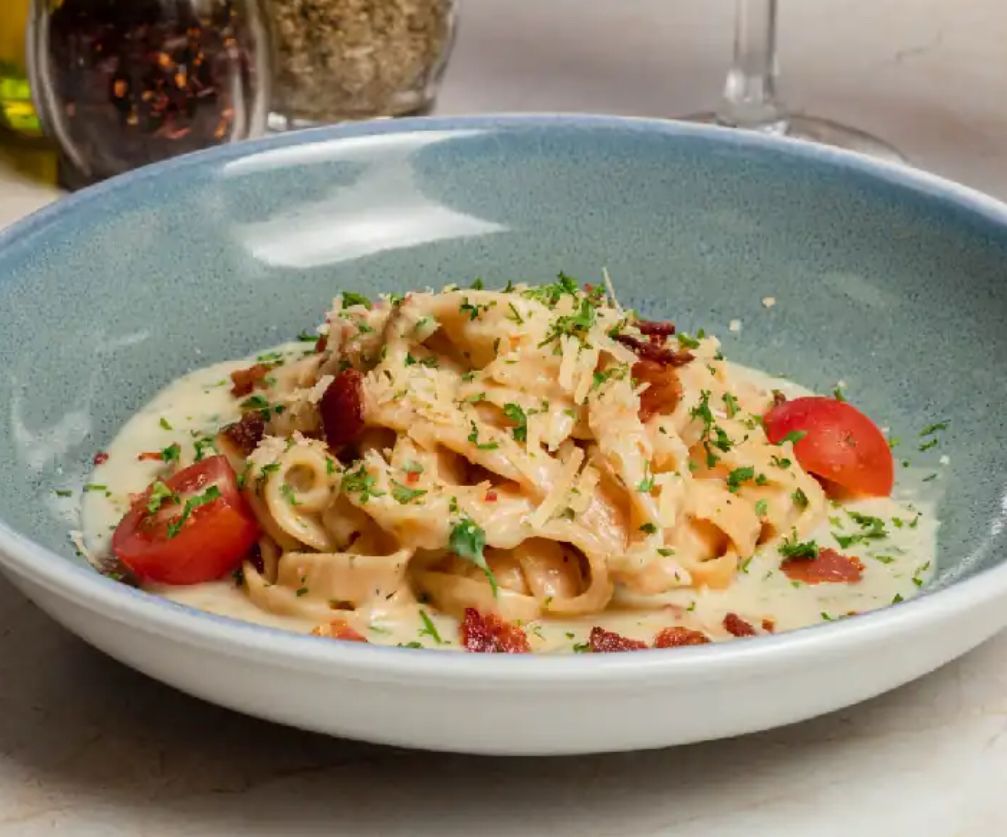 Fettuccine, salsa blanca de la casa y albahaca y pancetta