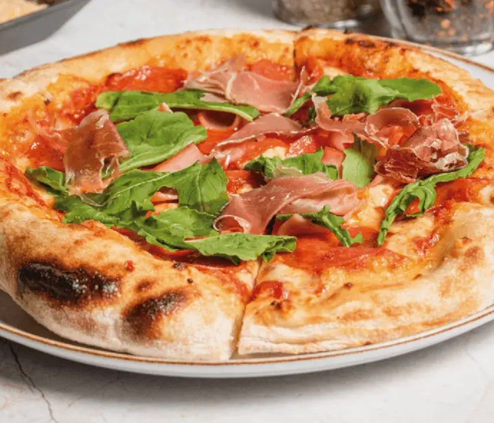 Tomate san marzano, queso mozzarella, stracciatella di burrata, prosciutto, tomate fresco, rúgula y queso parmesano.
