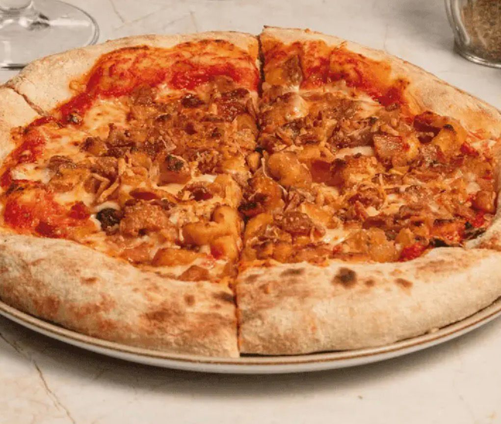 Pizza Mediana (6 porciones) Tomate san marzano, queso mozzarella, maduro y pancetta crocante.