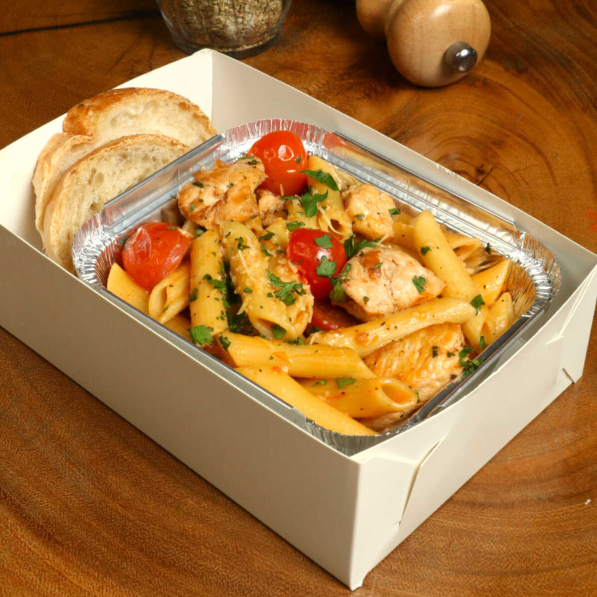 Pasta penne con pollo salteado perejil y tomate cherry Bañada con salsa blanca de la casa y salsa pomodoro. Acompañada de pan baguette.