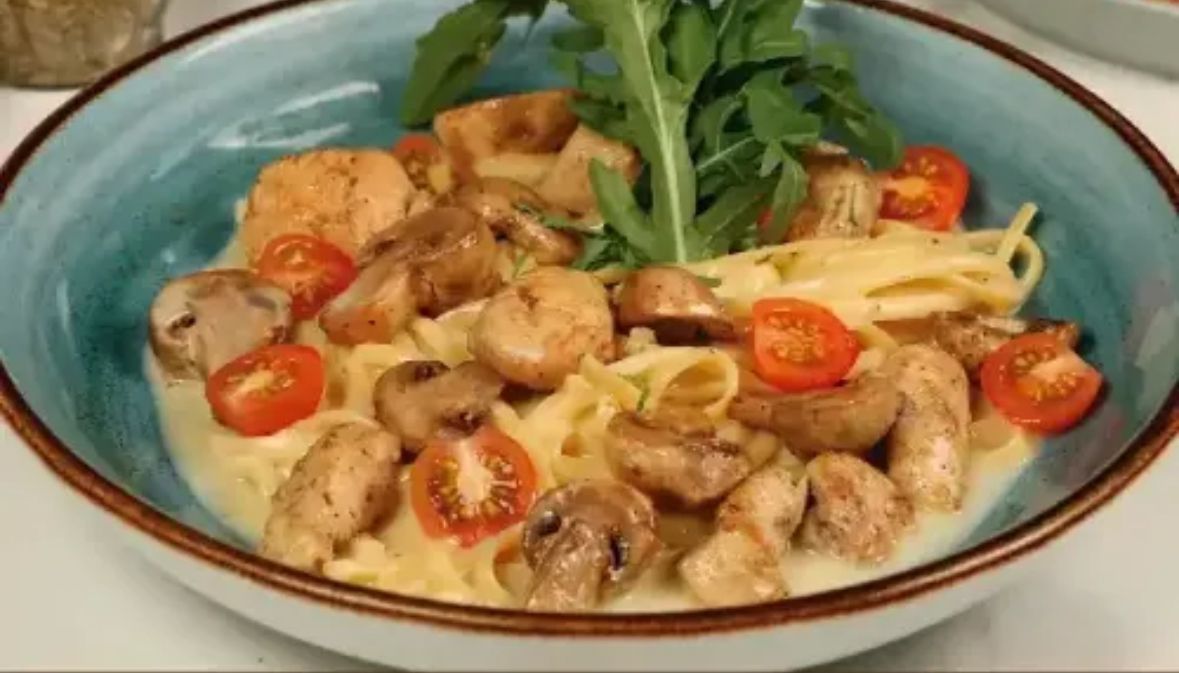 Pechuga de pollo en salsa blanca, pasta linguini, funghi tomate cherry y rugula + limonada natural