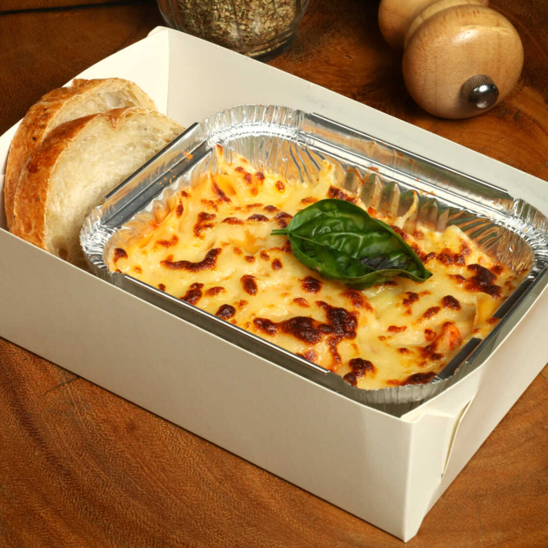 Lasaña pollo fungui Pollo, champiñones queso mozarella pasta canelloni artesanal salsa pomodoro. Gratinada al horno y acompañada de pan baguette.