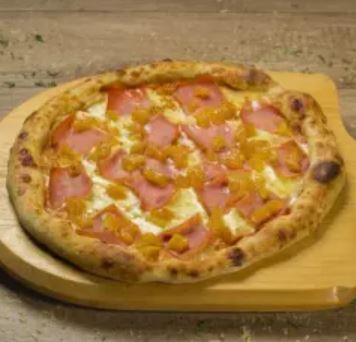 Tomate san marzano, queso mozzarella, jamón de pierna y piña caramelizada.