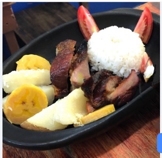 Jugosos trozos de carne a la llanera, acompañados con papa y yuca cocida. 2 a 3 personas.