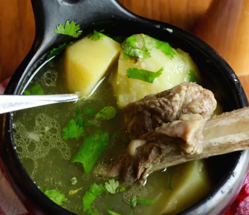 Exquisito caldo de res acompañado con porcón de arroz, trozos de carne a la llanera, papa cocida, yuca y maduro cocido.