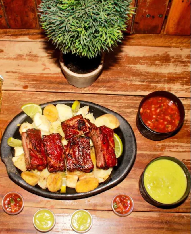 Jugosos trozos de costilla con el mejor sabor de nuestra parrilla. Acompañados con papa y yuca cocida. Para 1 o 2 personas.