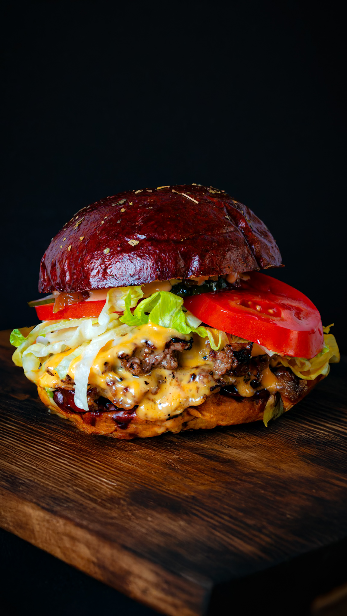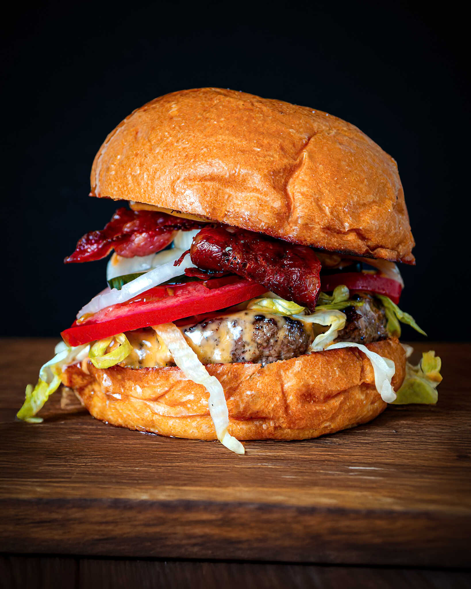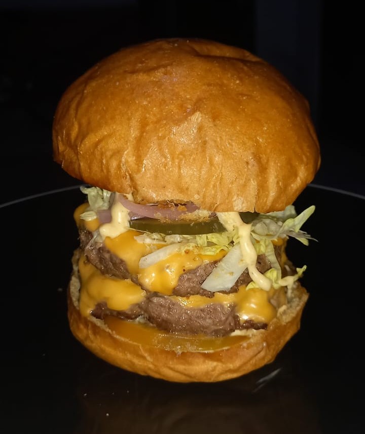 250 g De carne 100% angus, pan artesanal brioche o pretzel, doble queso americano, doble tocineta, queso doble crema apanado, lechuga batavia, tomate, pepinillos encurtidos, cebolla, salsas de la casa.