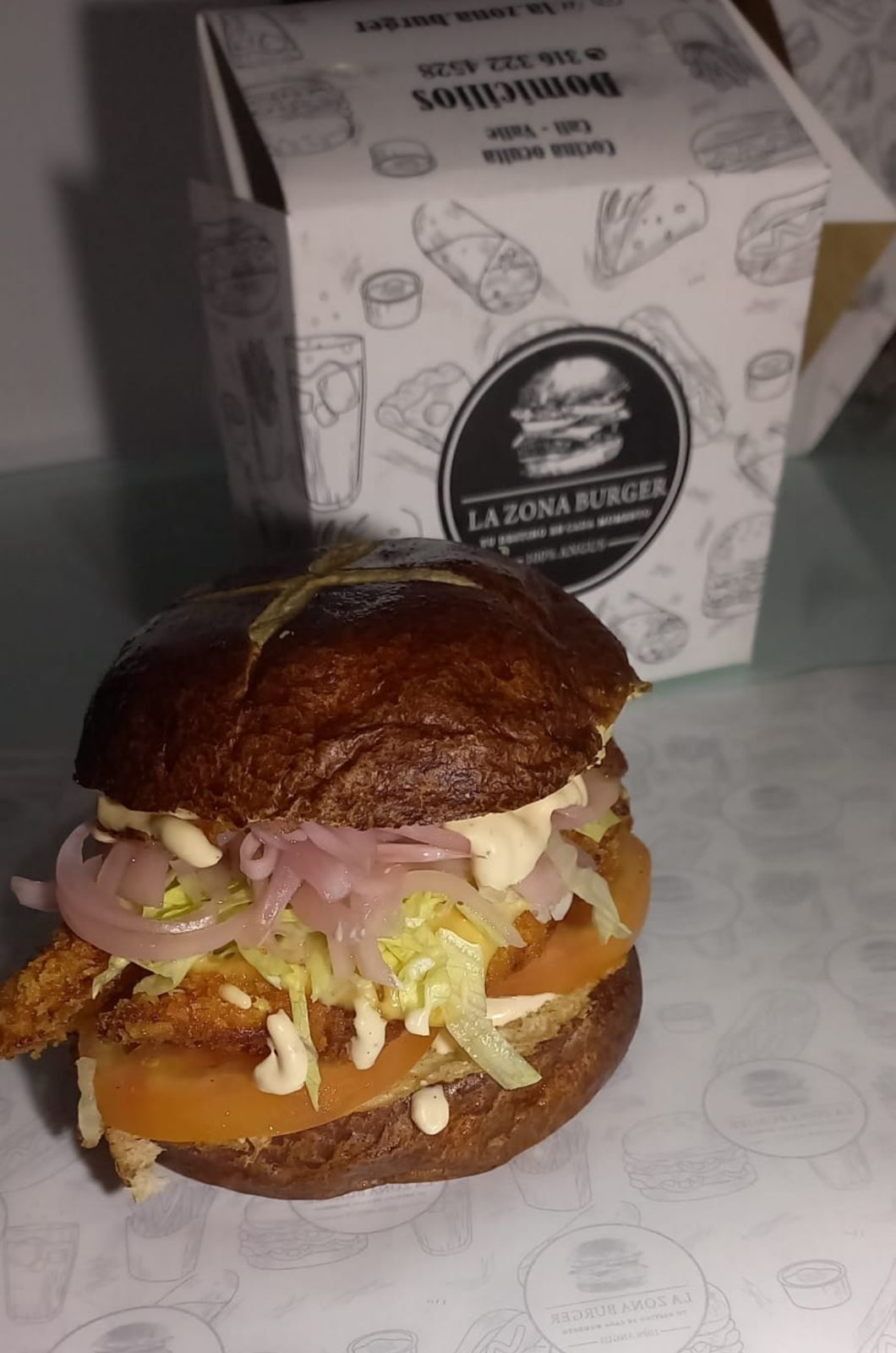 120 g De pollo apanado, pan brioche o pan pretzel, queso americano, tocineta, lechuga batavia, tomate, pepinillos encurtidos, cebolla, salsas de la casa.