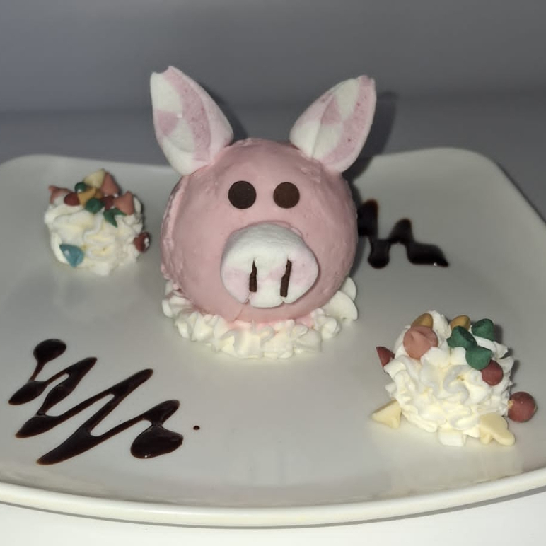 Una bola de helado, masmelos, salsa y chantilly.