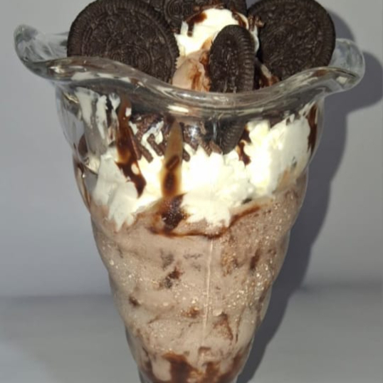 Helado, galleta oreo, salsa de chocolate y chantilly.