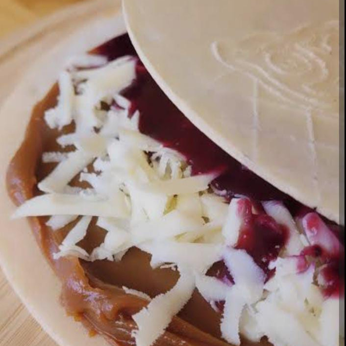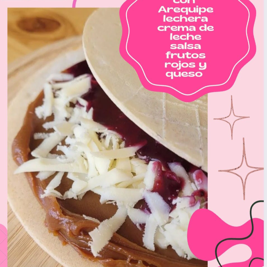 Oblea con arequipe, crema de leche, salsa de frutos rojos y queso.