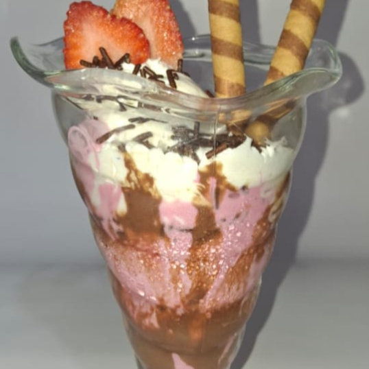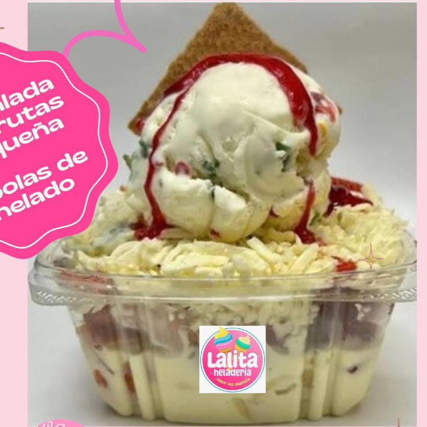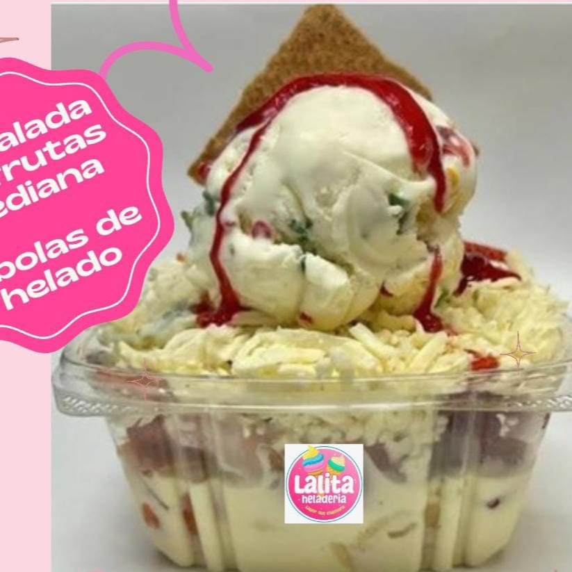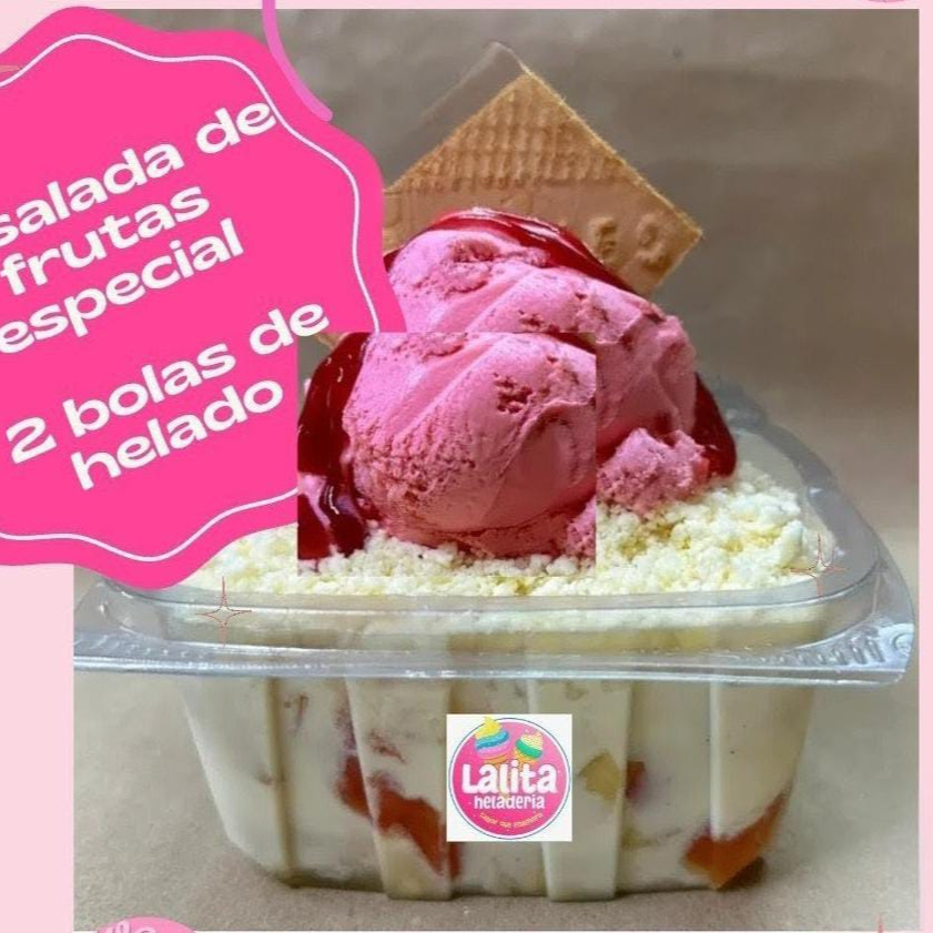 Mix de frutas, 1 bola de helado, crema de leche, lechera, galleta y salsa.