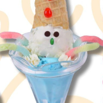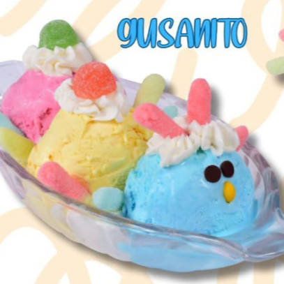 Tres bolas de helado gomitas y chantilly.