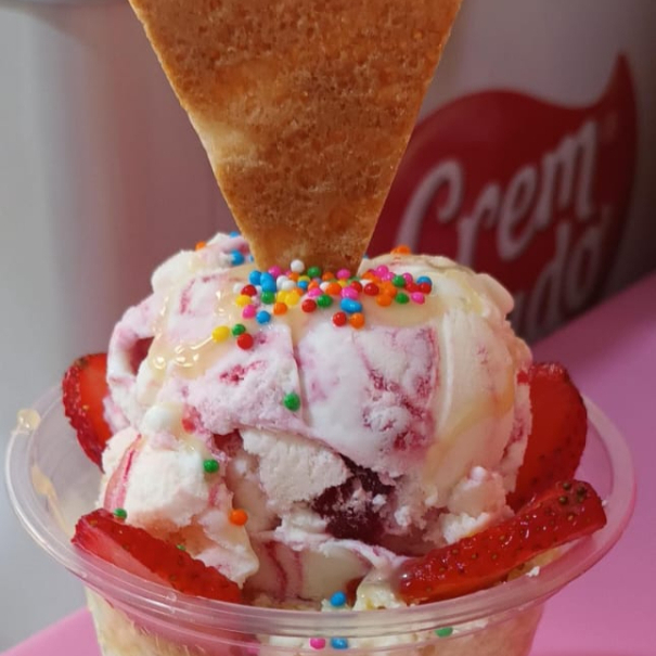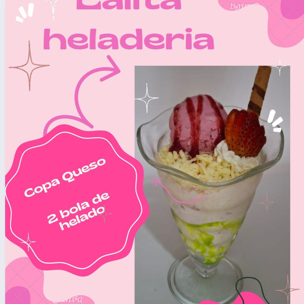 Dos bolas de helado, queso, crema de leche, lechera, salsa, fresa, barquillo y chantilly.