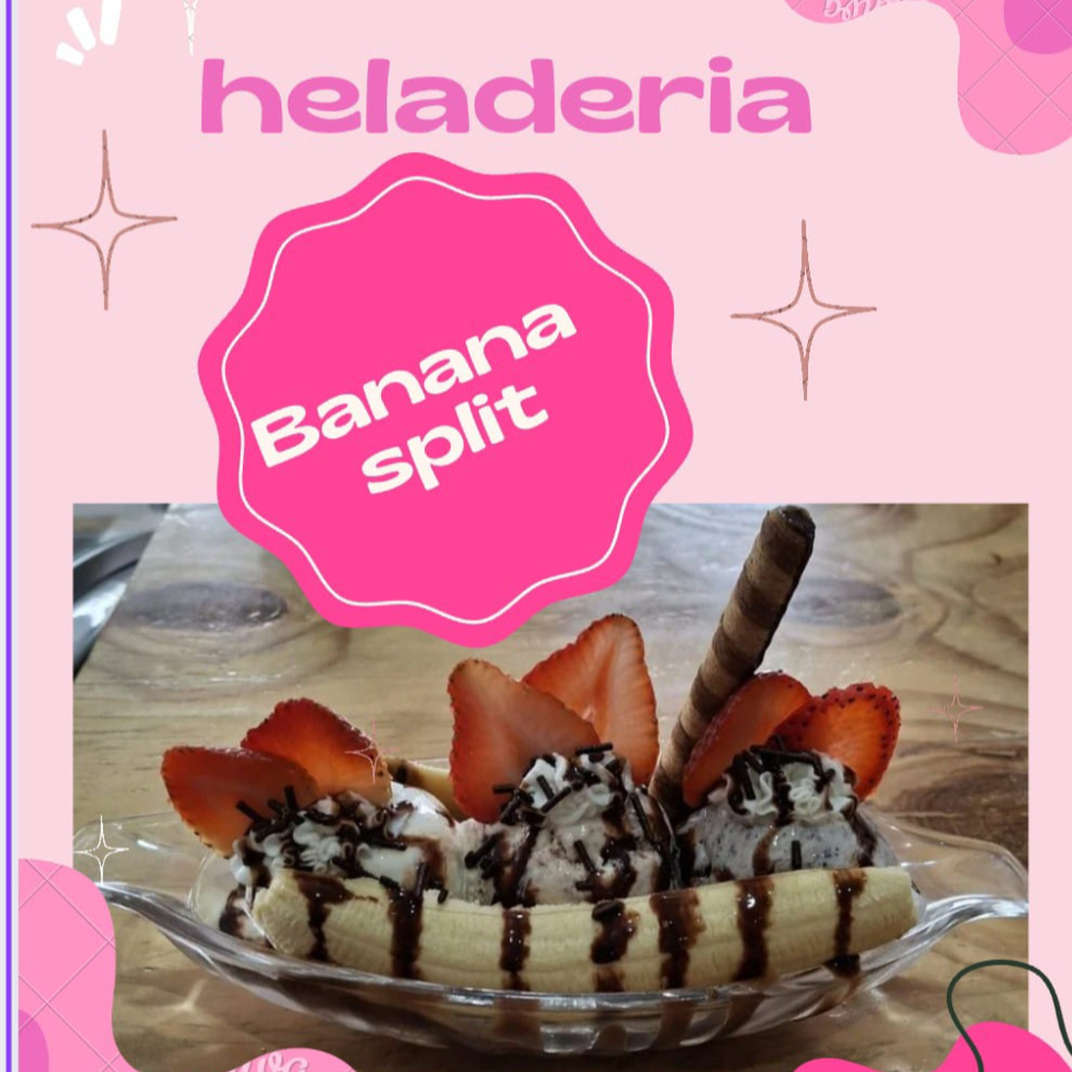 Tres bolas de helado, banano, salsa, fresa, barquillo y chantilly.