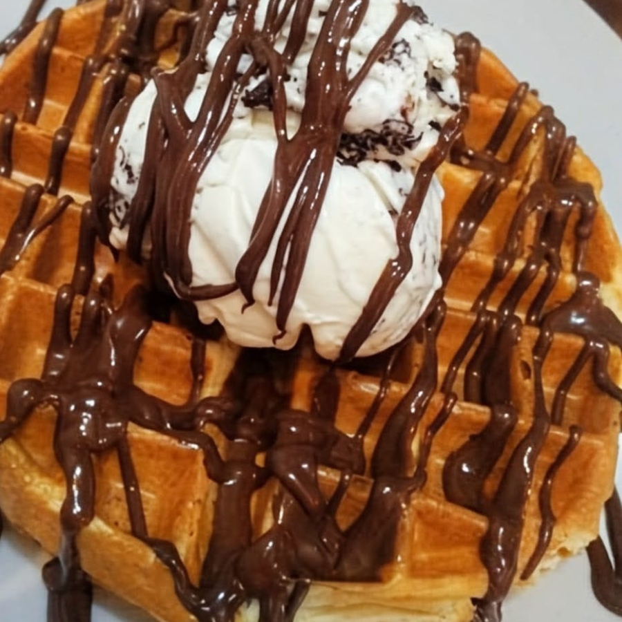 Una bola de helado, waffle, salsa de chocolate, chocolatina y chantilly.