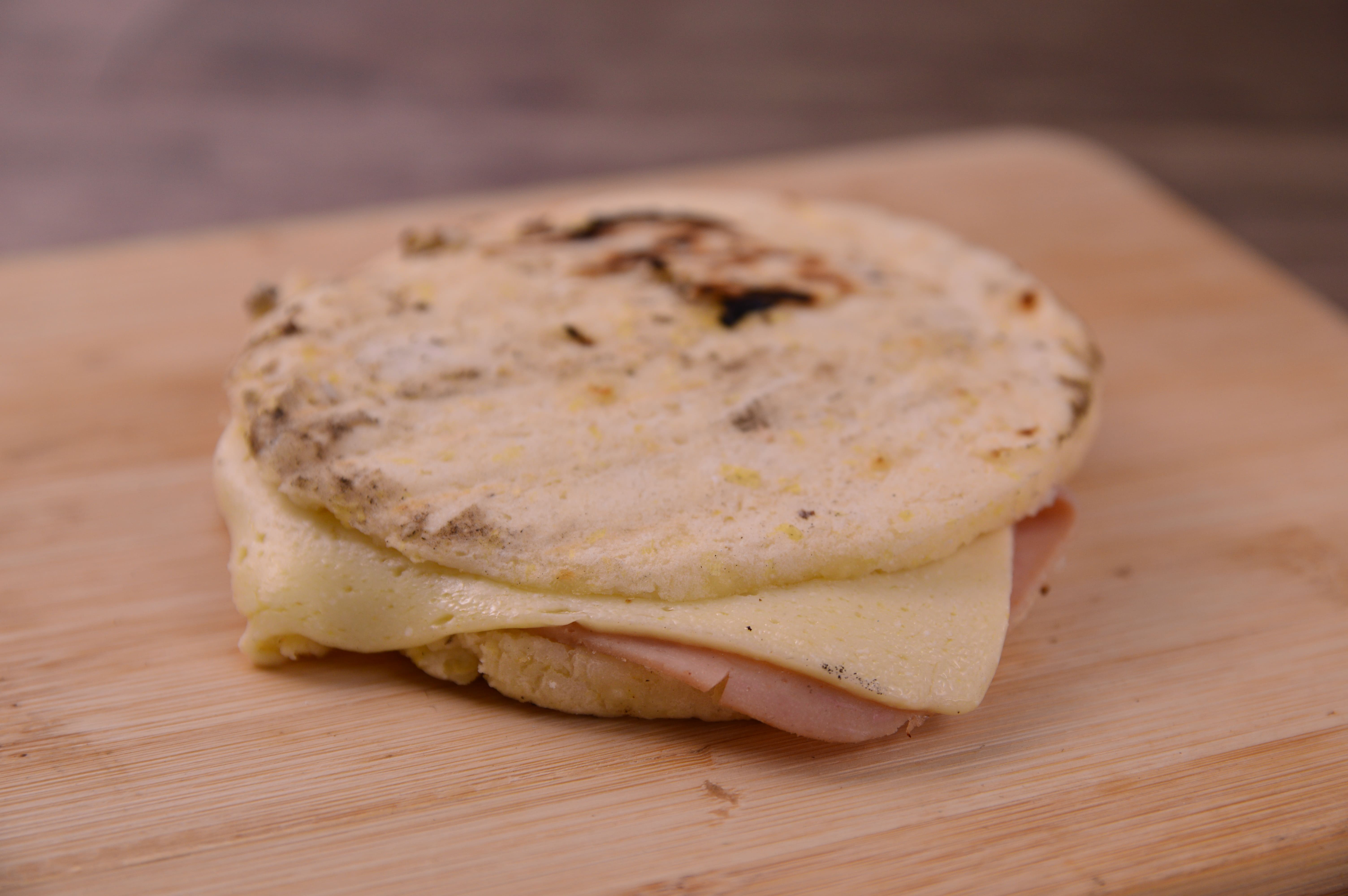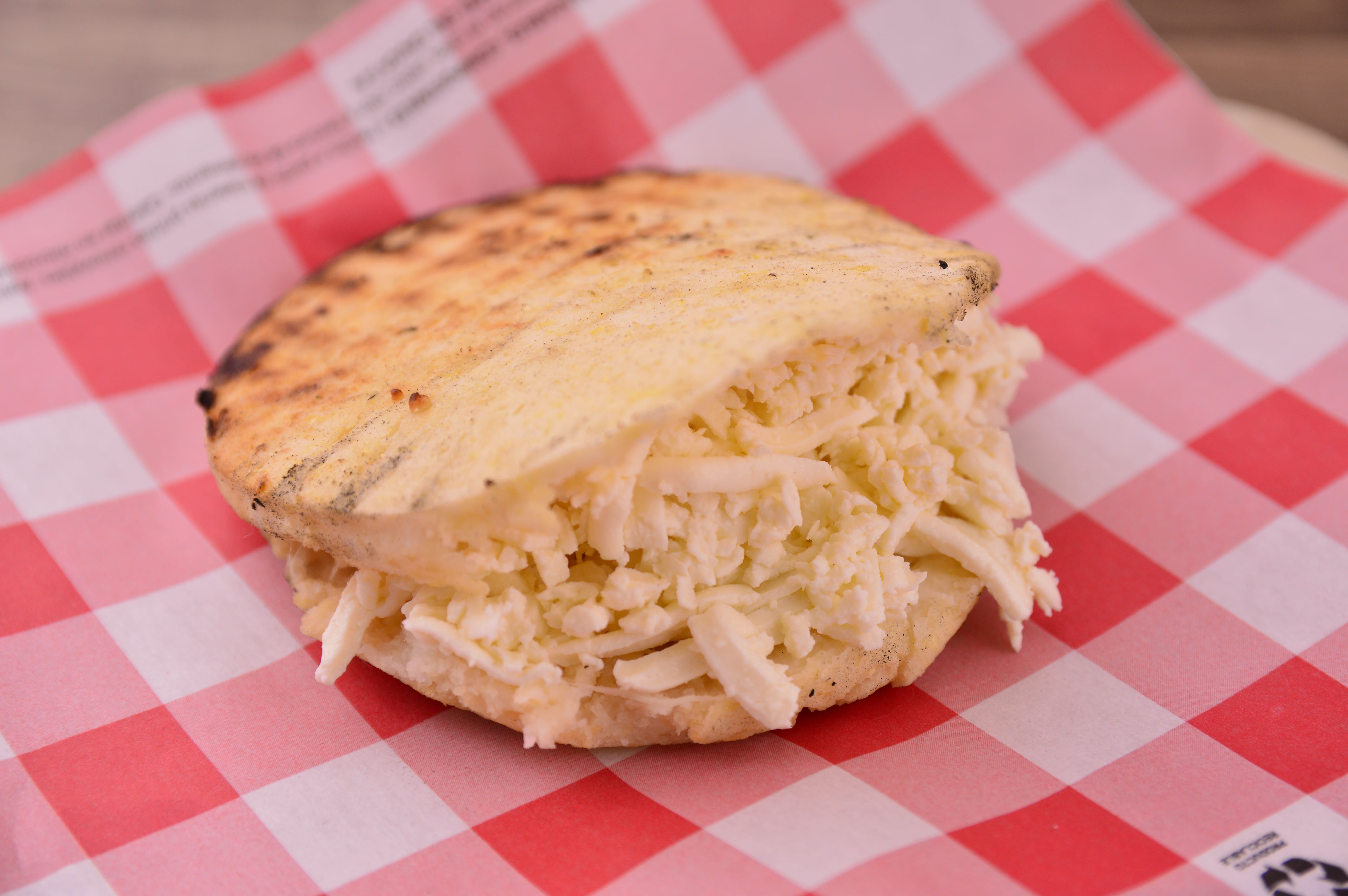 Arepa con carne de hamburguesa, queso lonchita, jamon, tomate, Lechuga, pollo desmechado y Salsas al gusto