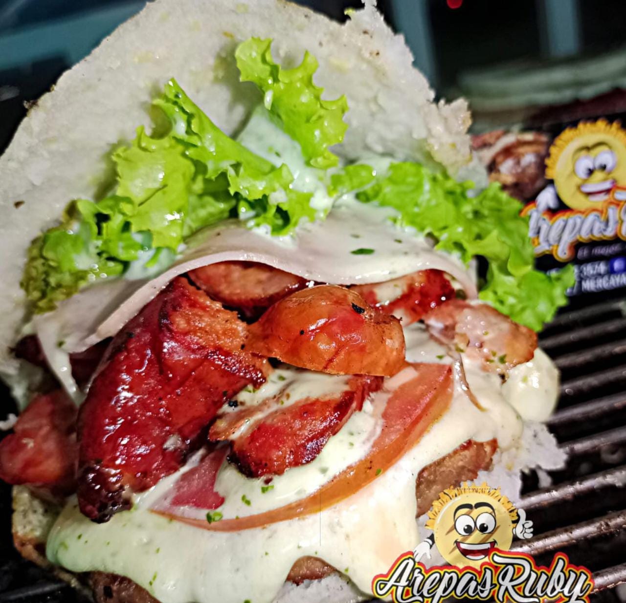 Arepa con carne de hamburguesa, queso, jamón, tomate, lechuga, chorizo picado de cerdo y salsas al gusto