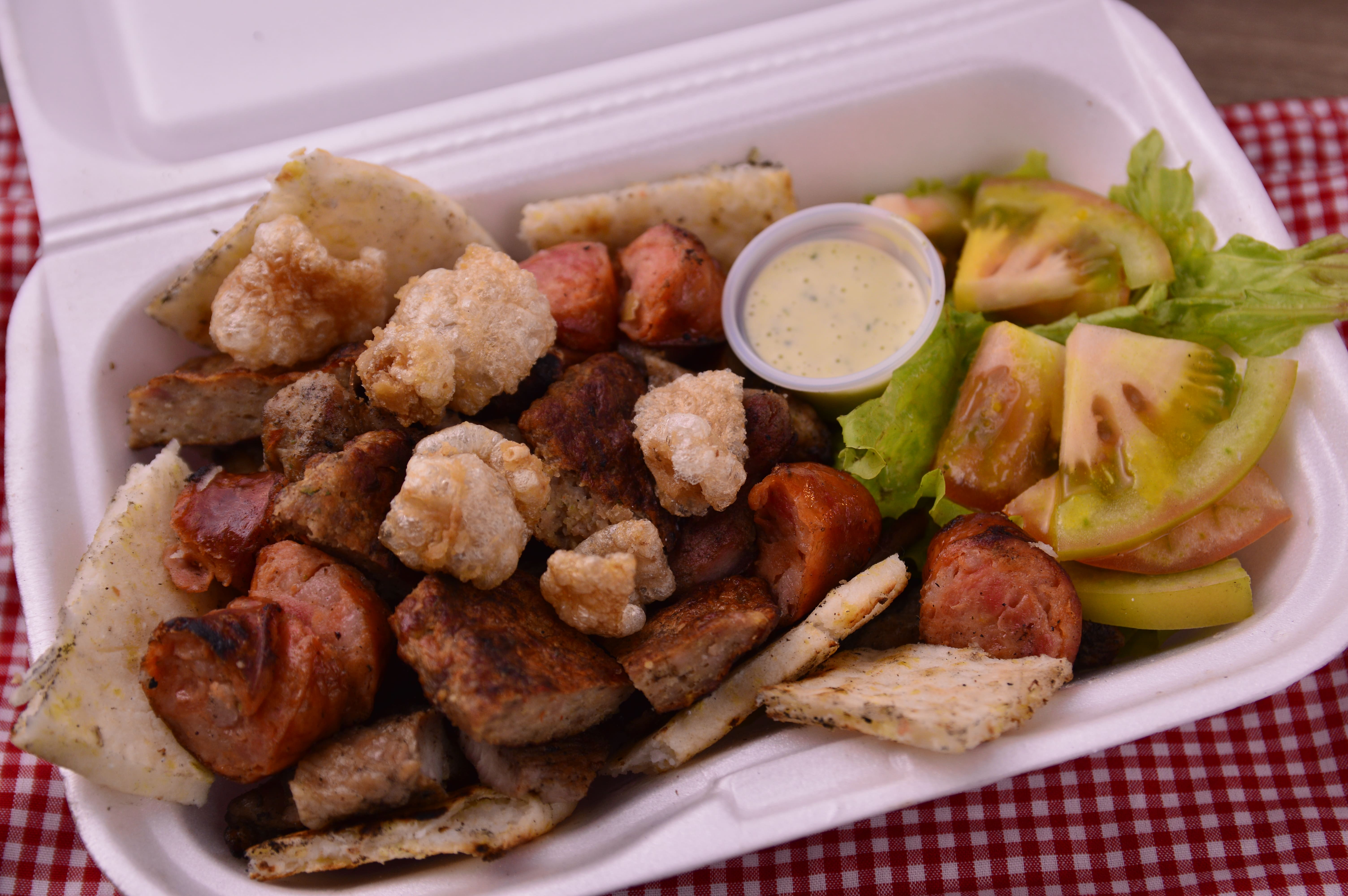 Carne de cerdo, chorizo, carne de hamburguesa, arepa, ensalada,maduro , chicharrón y salsa de la casa