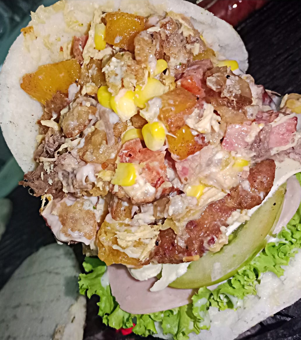 Carne desmechada, Pollo, Chicharrón, Carne de hamburguesa, Tomate, Lechuga, Queso lonchita, Jamón, Salsas al gusto y de la casa