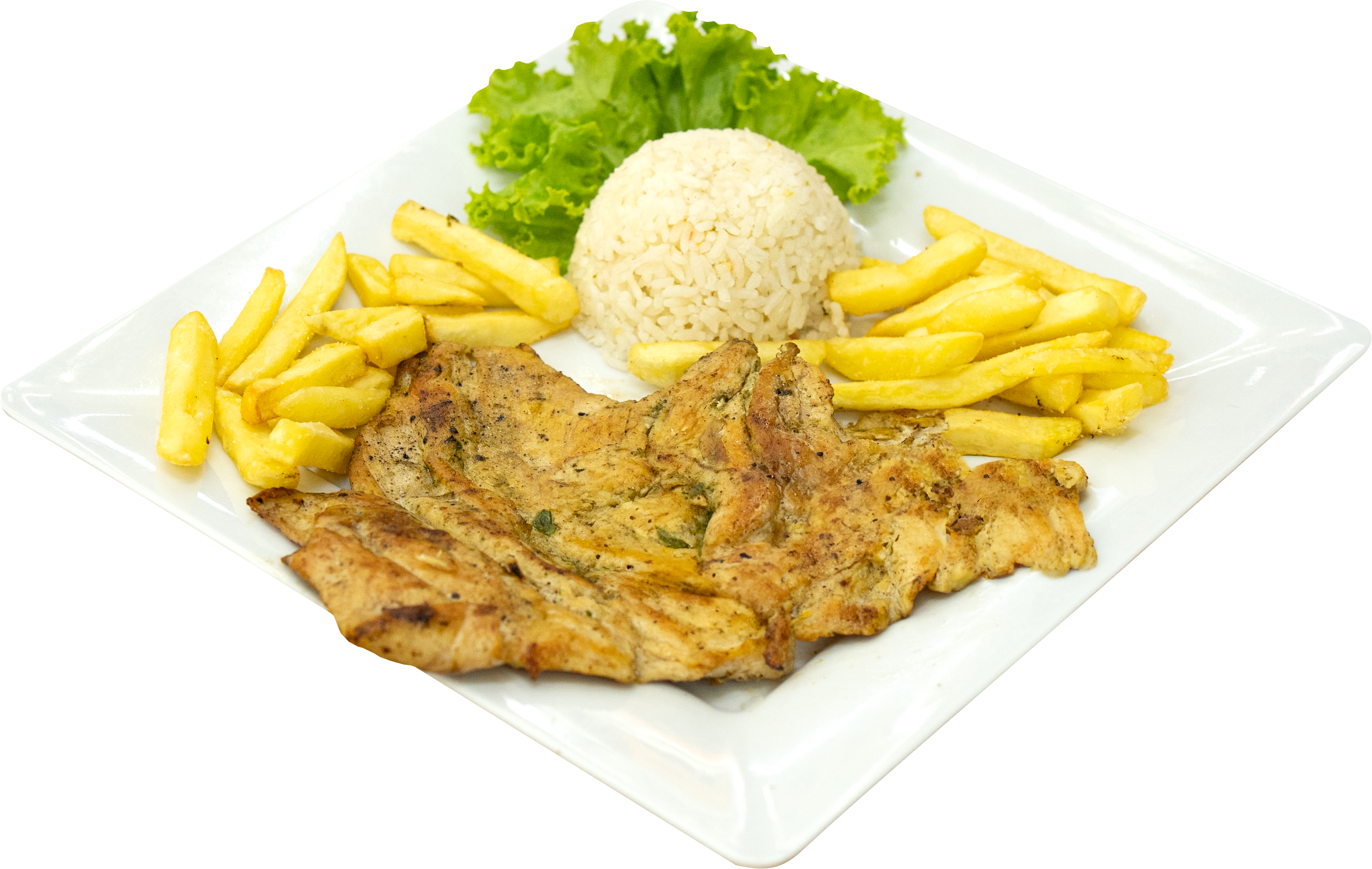 Un jugoso filete de pollo de 350 gramos, dorado lentamente a la plancha para conservar toda su suavidad y sabor. Acompañado de doradas papas a la francesa y una ensalada fresca de tomate, cebolla, limón y cilantro, que aporta un toque ligero y refrescante a cada bocado.