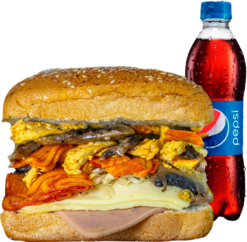 Pan artesanal brioche esponjoso con semillas blancas, relleno con de pollo aliñados, deliciosa tocineta crocante, aderezo de champiñones salteados en salsa de la casa, cortes finos de batavia, tajada de jamón y mozzarella + papas a la francesa (120 gr) + Gaseosa Postobon 250ml