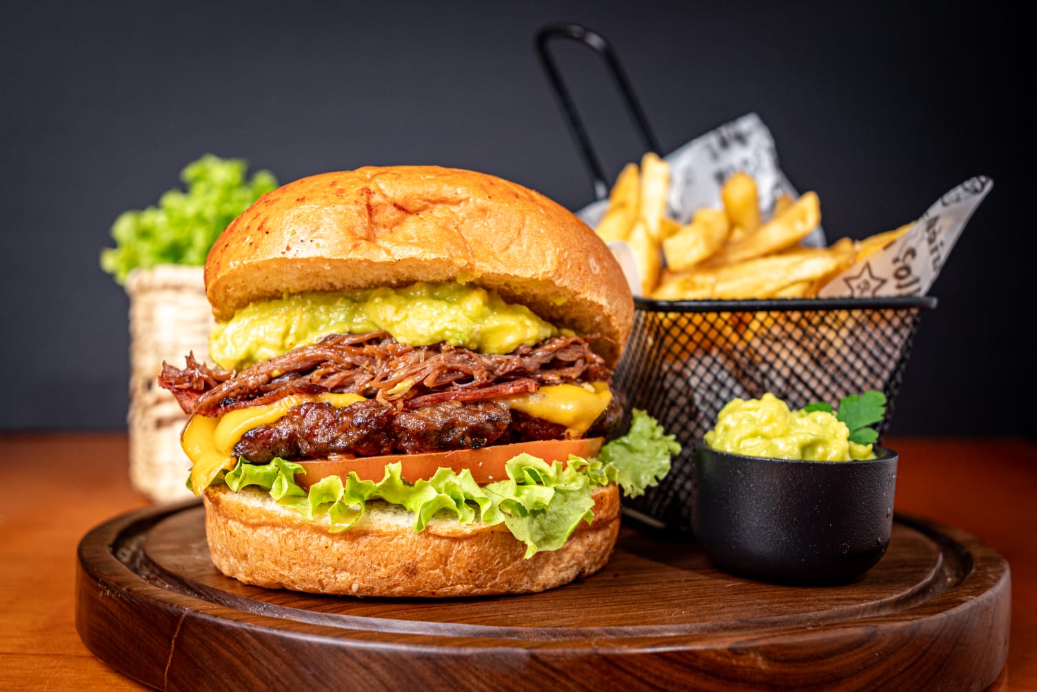 Krusty mechuda: pan brioche,carne,queso americano,tocineta,carne desmechada,guacamole,salsa de ajo + papas + bebida