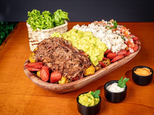 para maximo 5 personas, la cual incluye: papa a la francesa ( 300 gramos) ó papa amarilla ( 400 gramos), salchicha manguera ( 400 gramos), ripio de papa, chorizo ( 1 unidad), pollo ( 150 gramos), plátano maduro ( 100 gramos), tocineta ( 50 gramos), maíz ( 80 gramos , carne de hamburguesa ( 150 gramos), salsa de tomate, salsa de ajo, salsa rosada, salsa showy, bbq. piña ( opcional)
