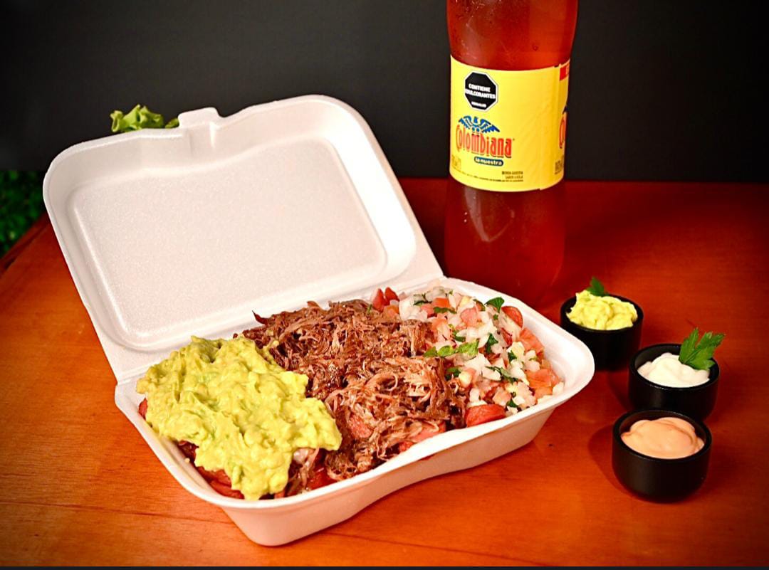 Salchimechuda: papa,salchicha,salsas,carne desmechada,guacamole,pico de gallo