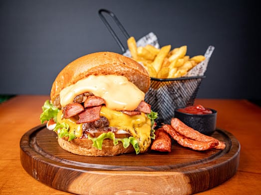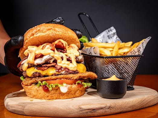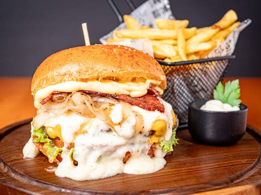 Pan, doble carne angus, filete de pechuga de pollo asado o apanado, triple queso americano, triple tocineta, lechuga y tomate, acompañado de papa a la francesa.