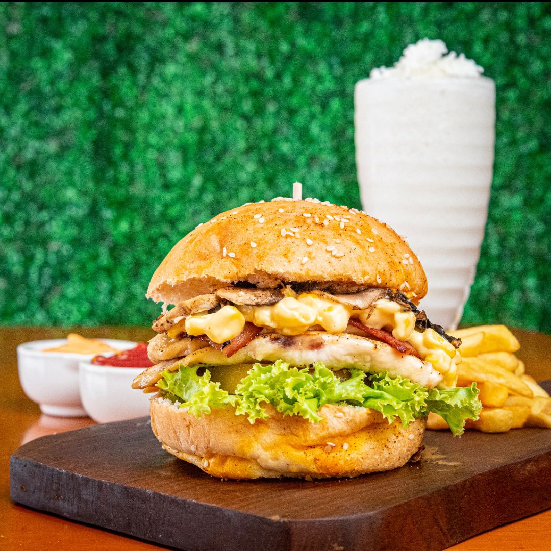 Pan brioche,filete de pollo apanado,queso mozarella,tocineta,gratinado de maiz con champiñones,lechuga y tomate acompañada de papas