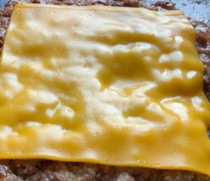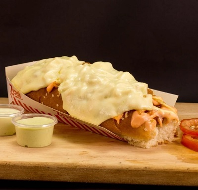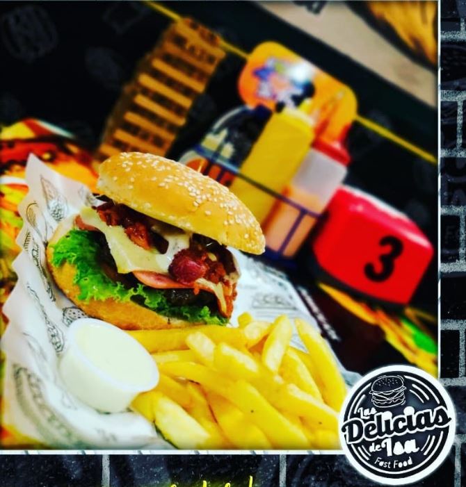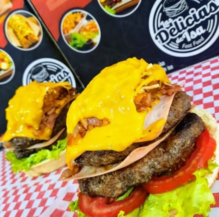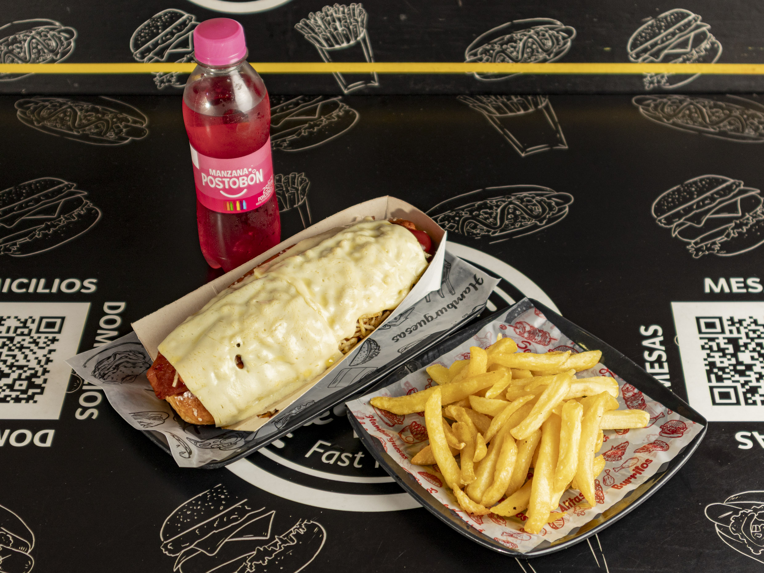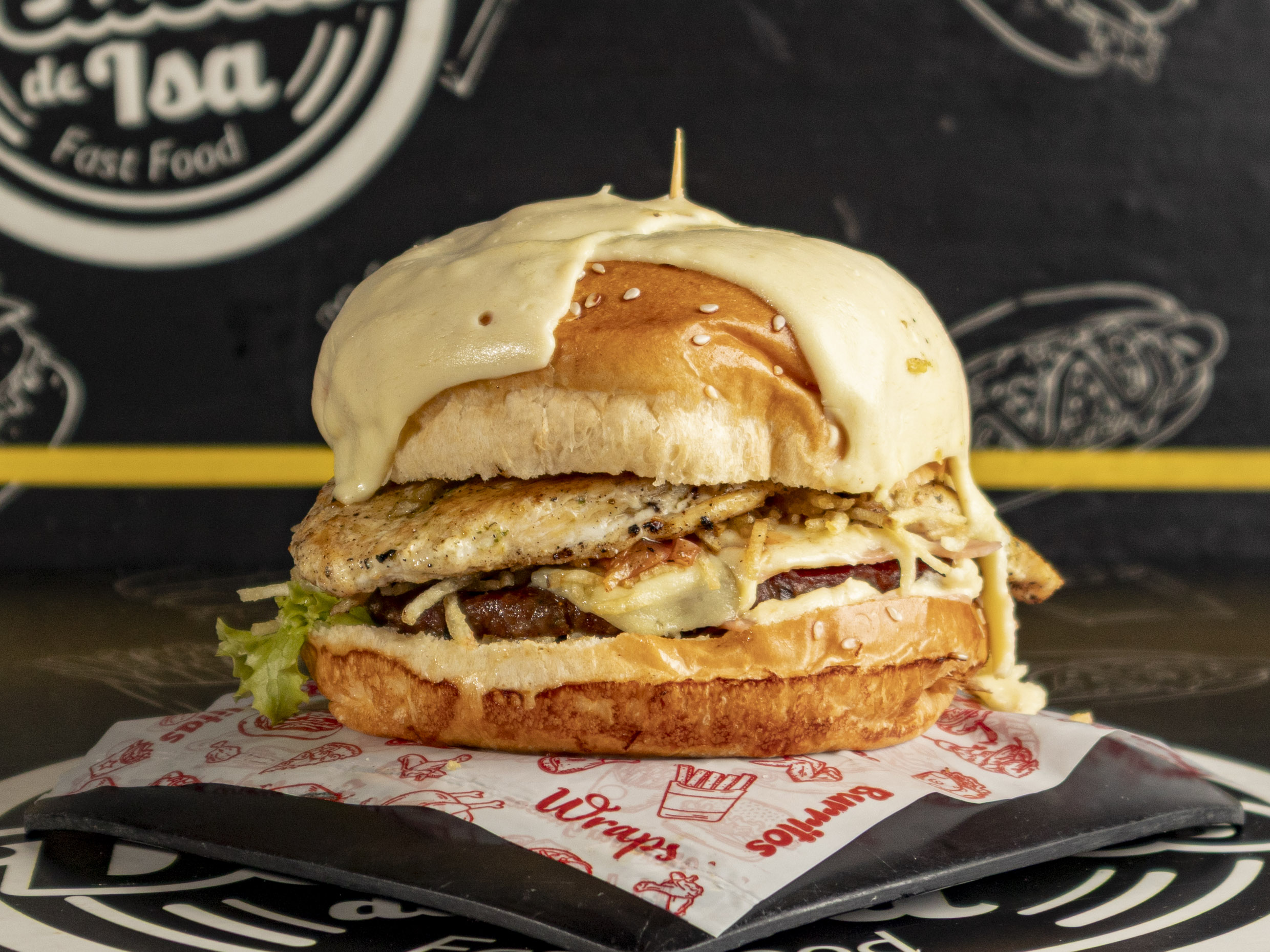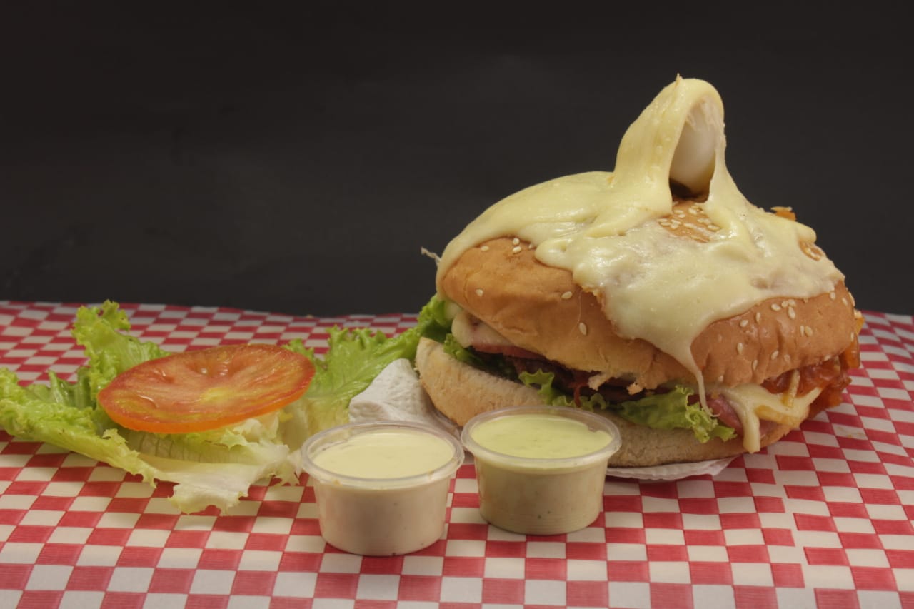 Pan de hamburguesa, carne de res o filete de pollo, queso doble crema, jamón, cebolla, lechuga, tomate, ripio de papa, salsa. (Bañada en queso).