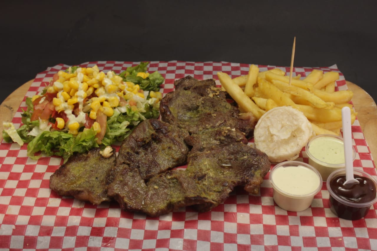 150gr costilla ahumada, 150gr de filete de pollo, arepa, papa amarilla, ensalada, salsa verde y BBQ.