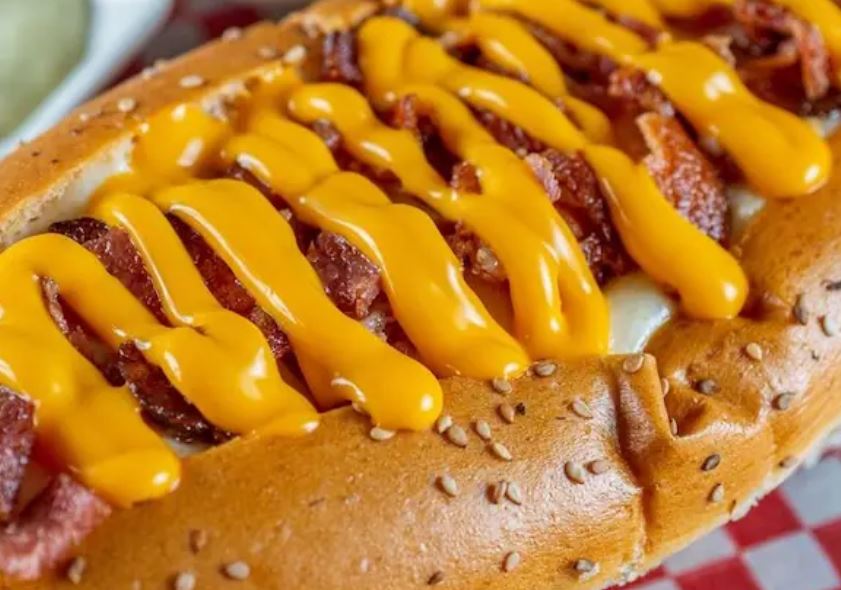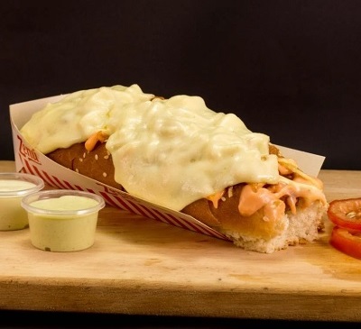 Pan perro, queso, jamón, cebolla y ripio de papa.