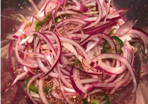 Pan perro bimbo, salchicha zenu, ripio de papa, cebolla, salsa de la casa