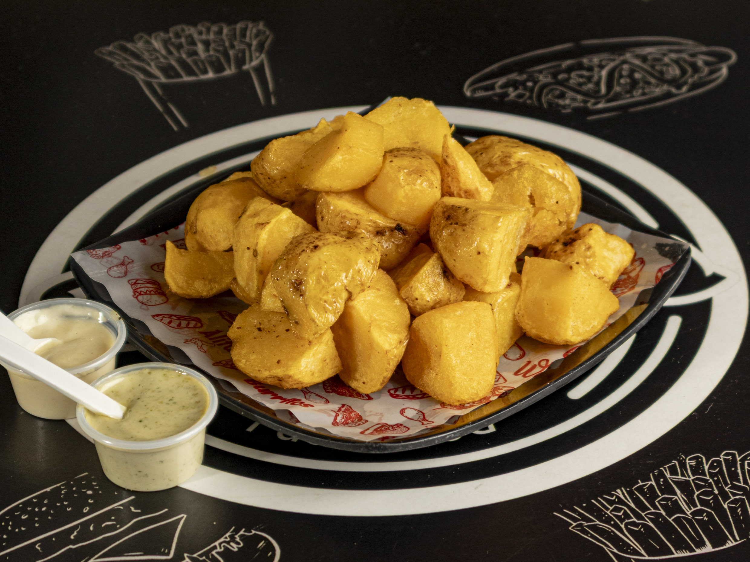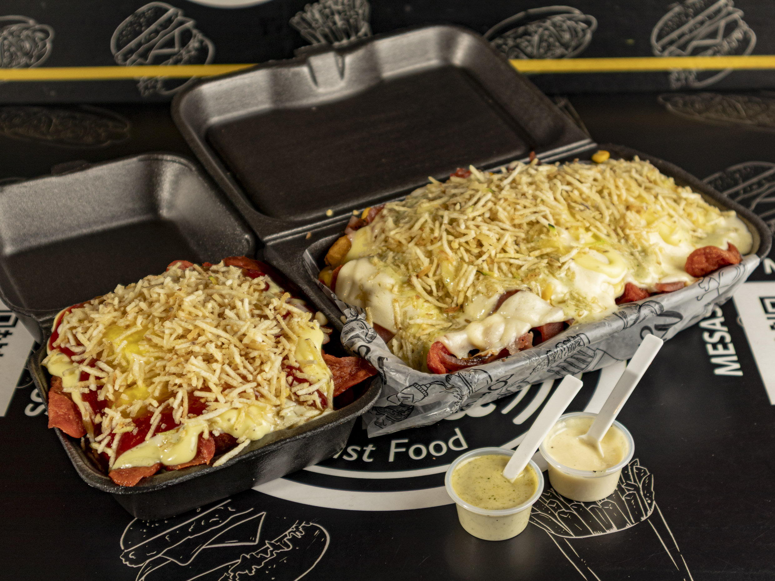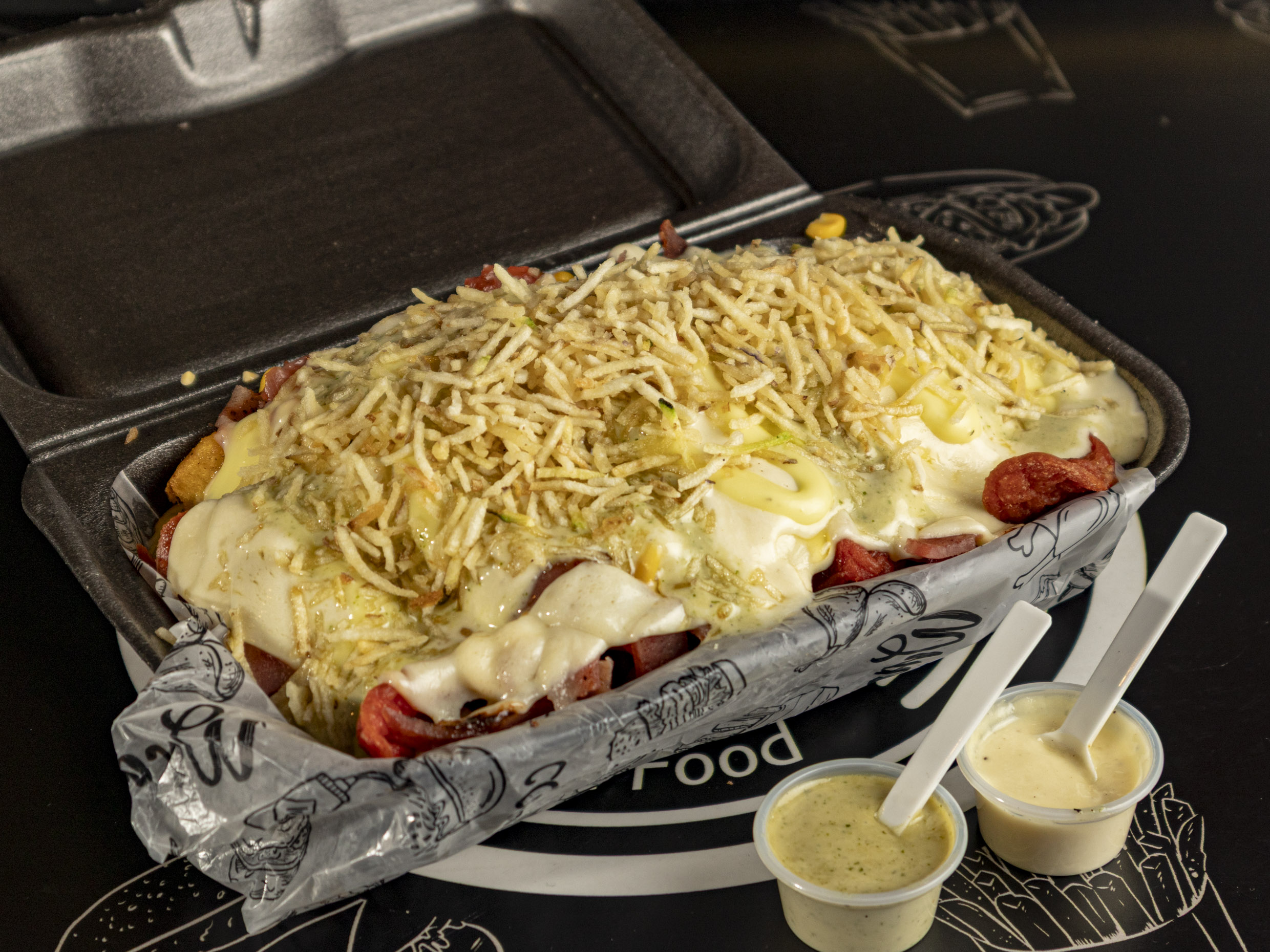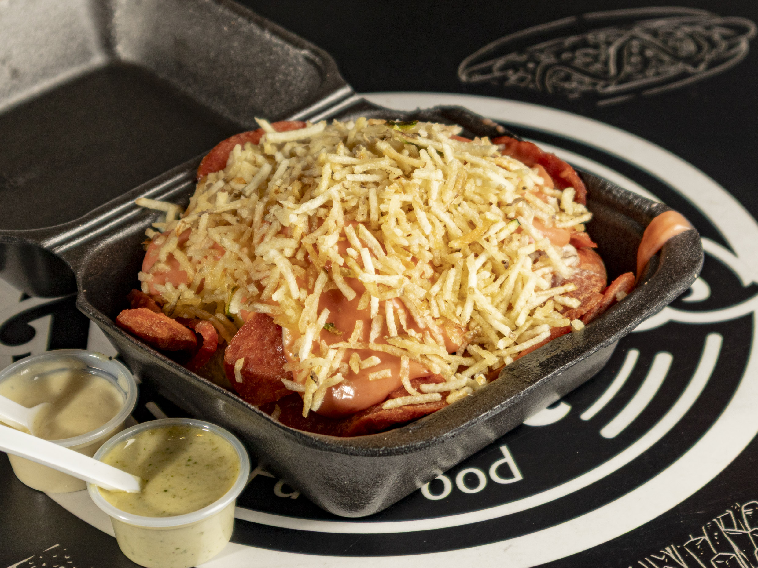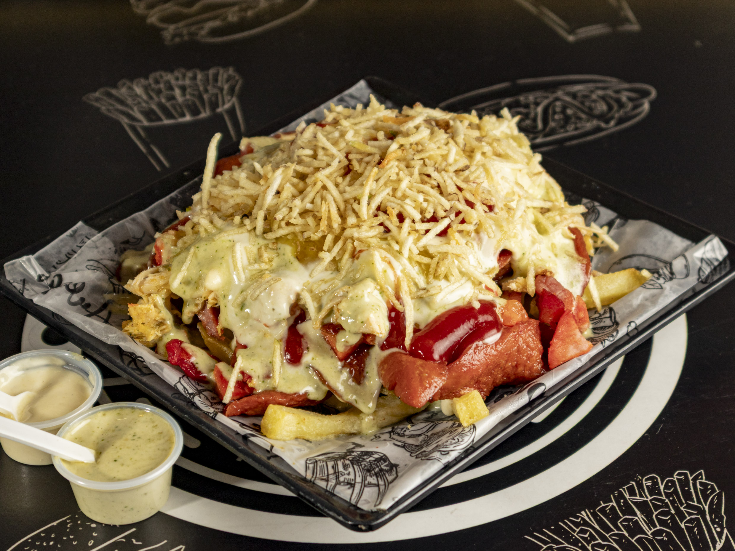 Papa amarilla, salchicha, queso, salsas de la casa y ripio de papa.