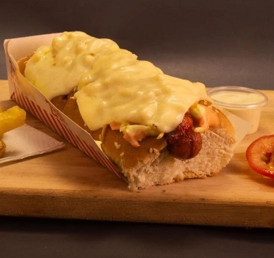 Papa amarilla, Salchicha, papa, queso, ripio, salsas.