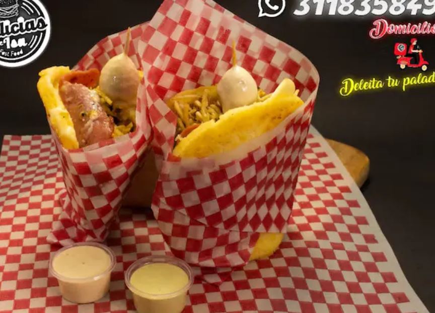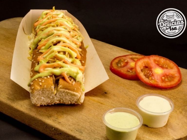 Papa amarilla, salchicha, doble queso, salsas de la casa, ripio de oaoa
