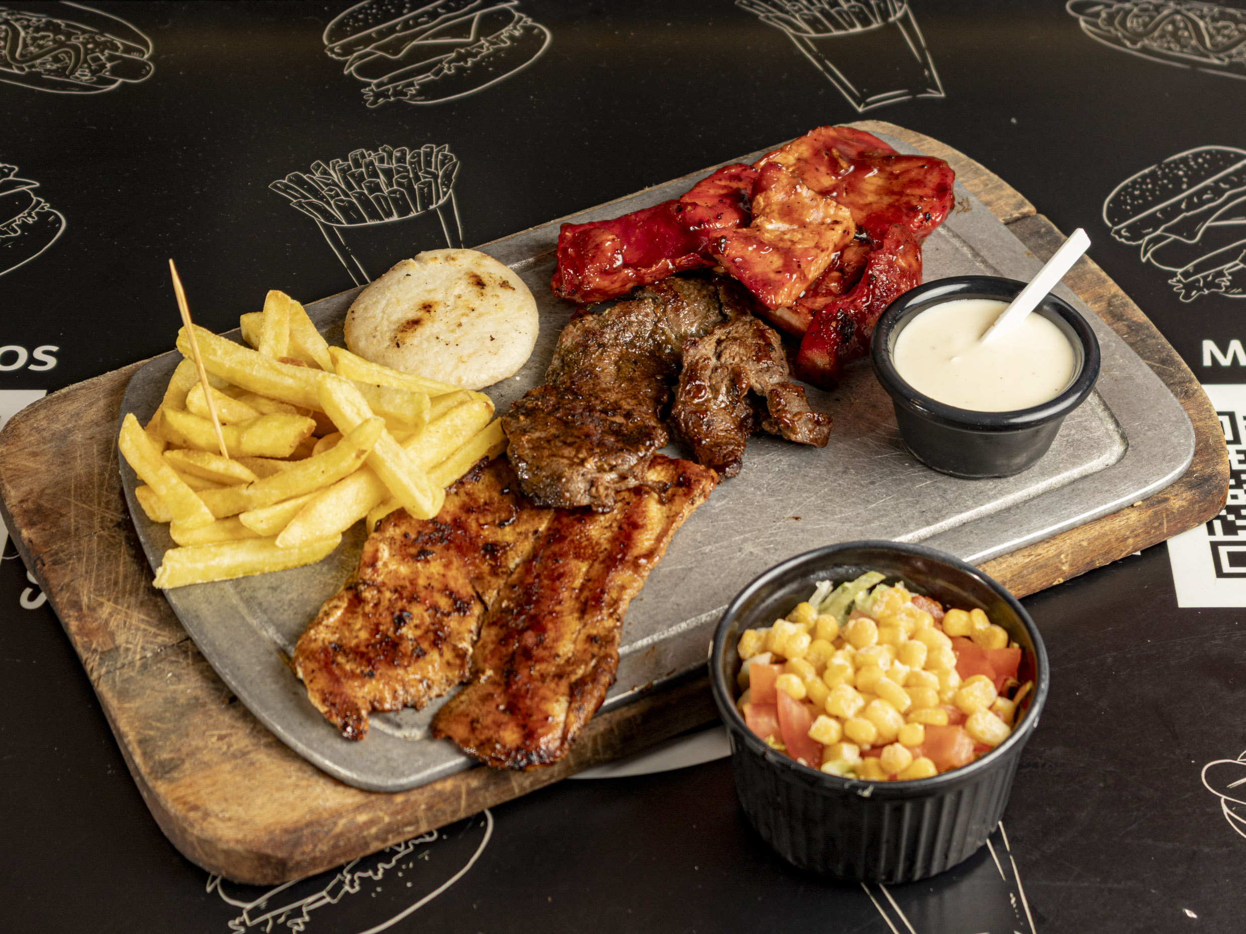 Costilla ahumada, carne de res, filete de pollo, chorizo acompañados con ensalada, arepa, papa a la francesa y papa cocida.