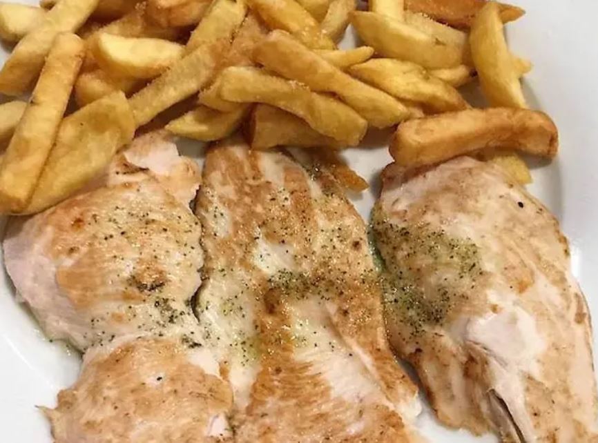 250gr filete de pollo, papa a la francesa o papa amarilla, ensalada y arepa.