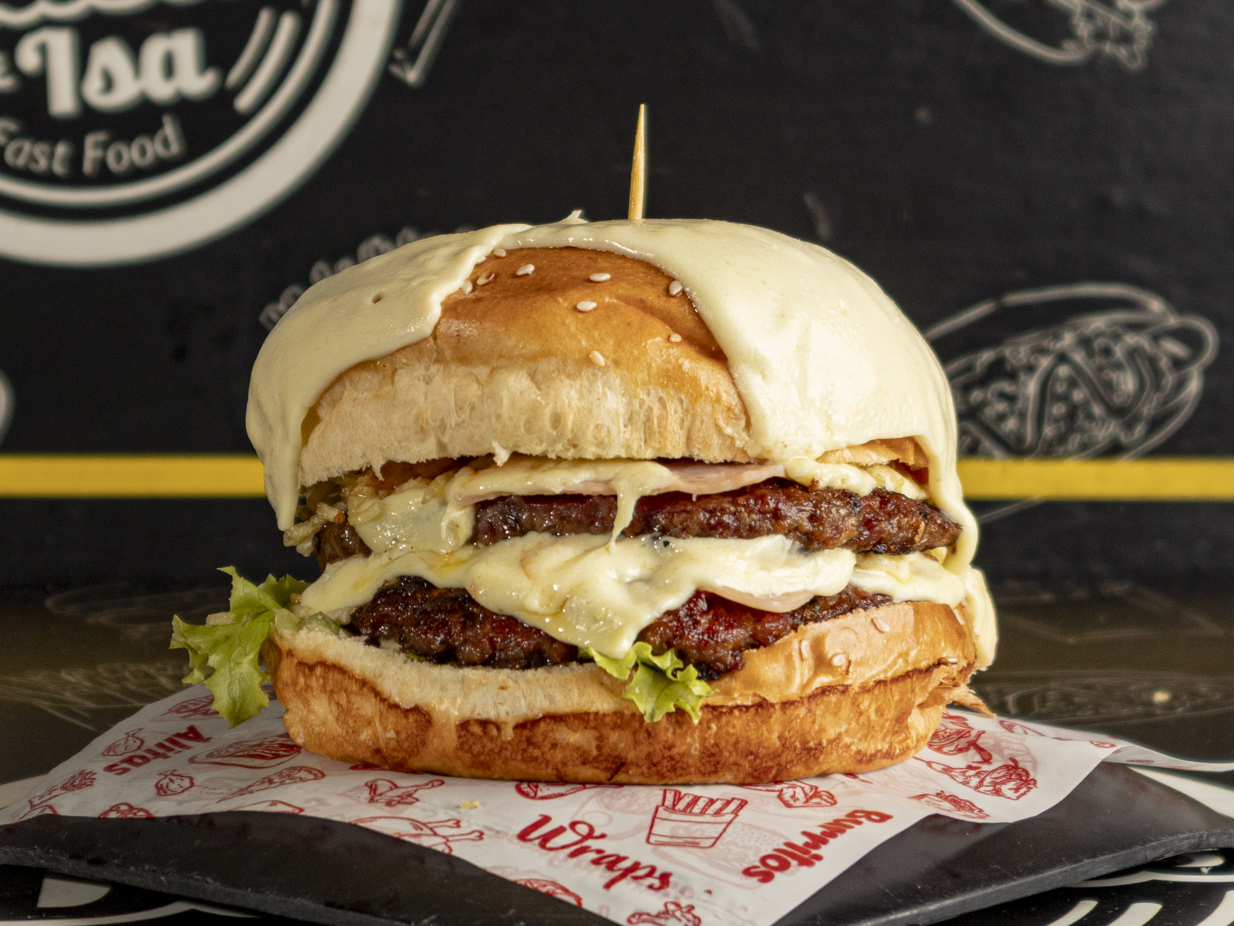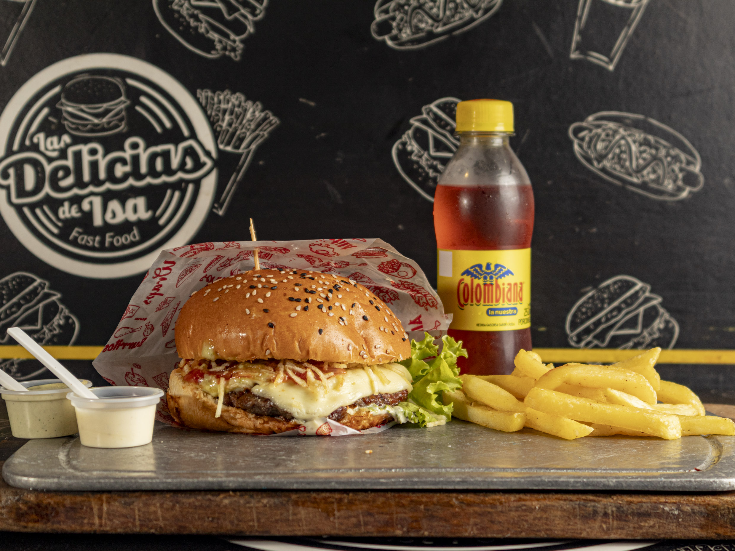 Pan de hamburguesa, 2 carnes de res, queso doble crema, jamón, cebolla, lechuga, tomate, rápido de papa, salsas.