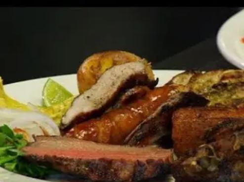 Costilla ahumada, carne de res, filete de pollo, chorizo acompañados con ensalada, arepa, papa a la francesa y papa cocida.