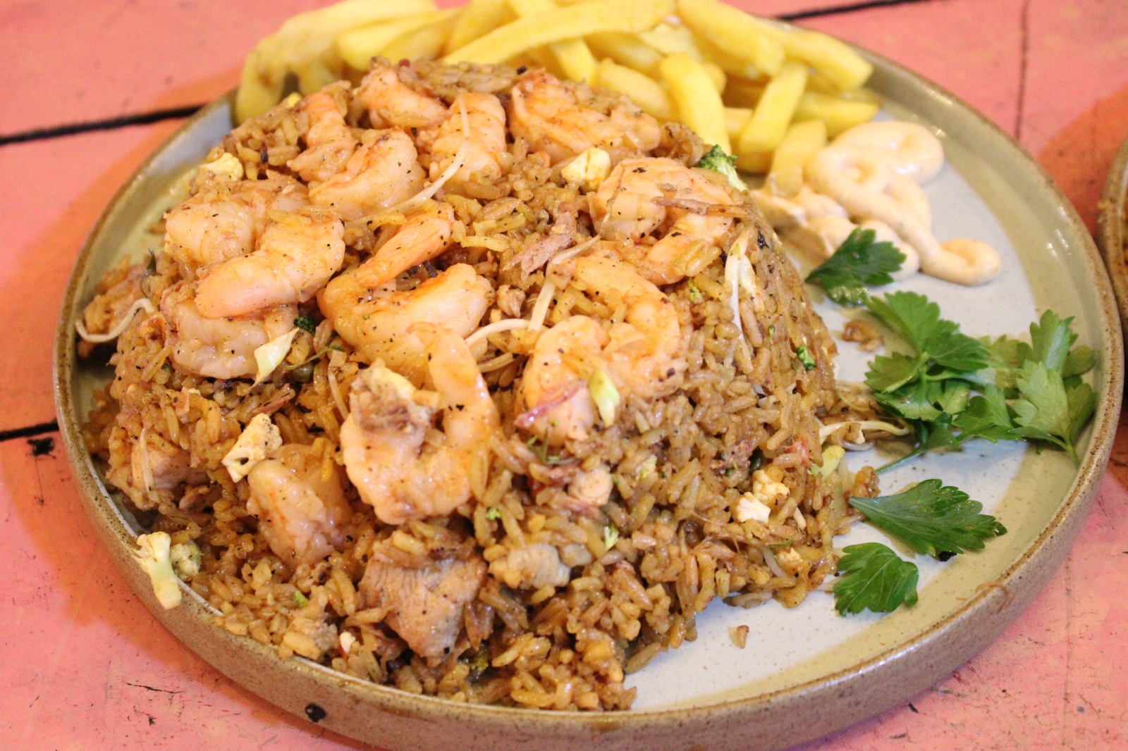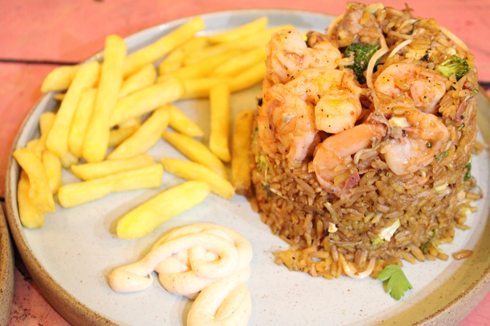 Arroz salteado en salsa de la casa con Camarones, trocitos de lomo de cerdo, costilla de bufalo, jamón y verduras orientales, acompañado de papas ala francesa