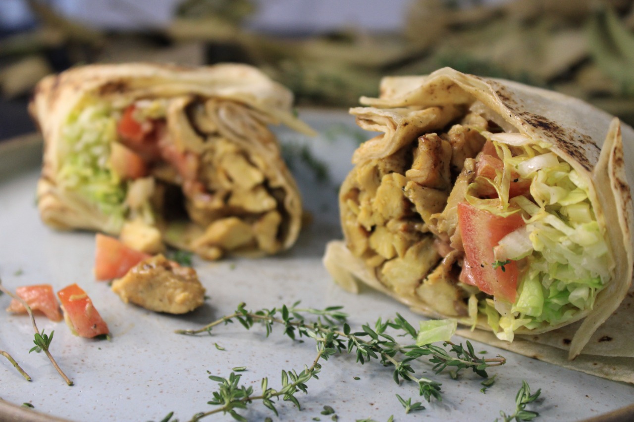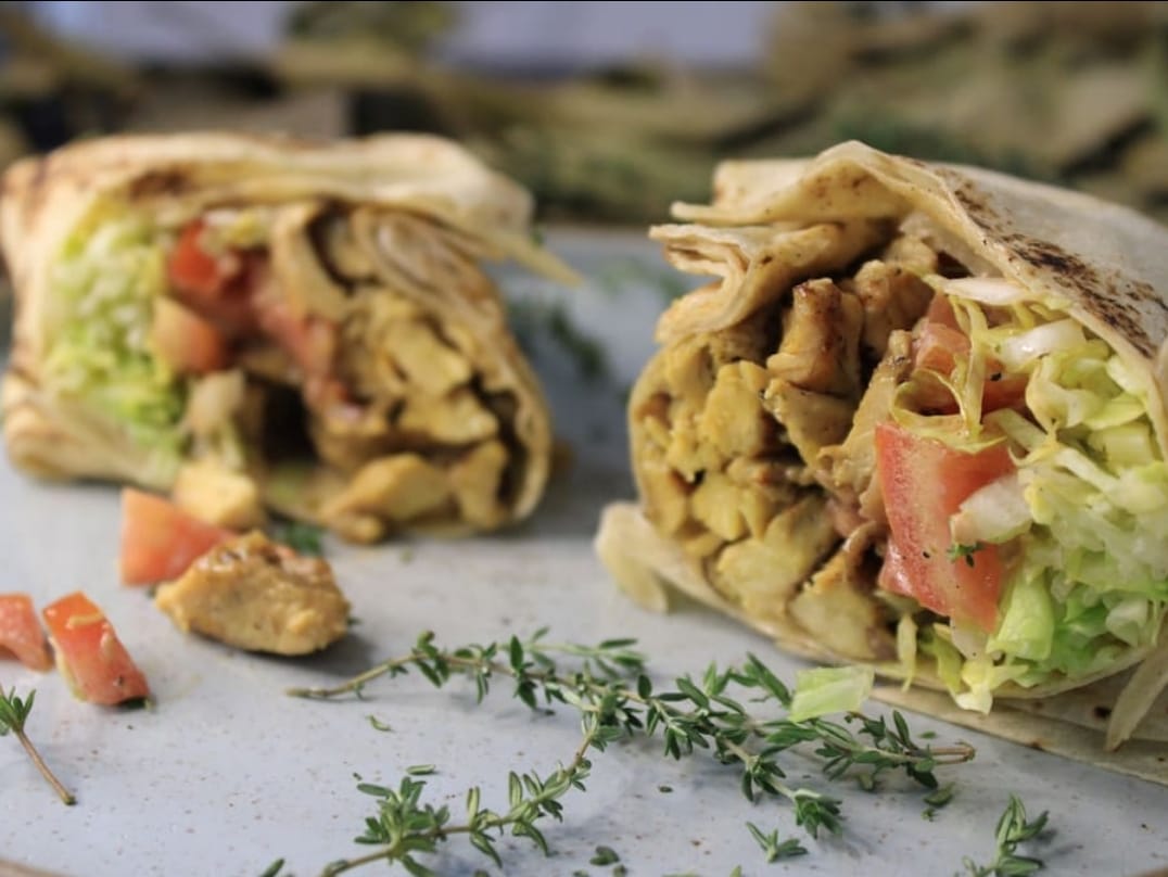 Rollo de pan árabe envuelto de trozos de pollo, lechuga, tomate y salsa de la casa.