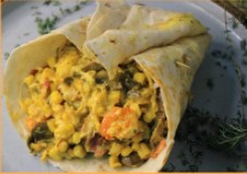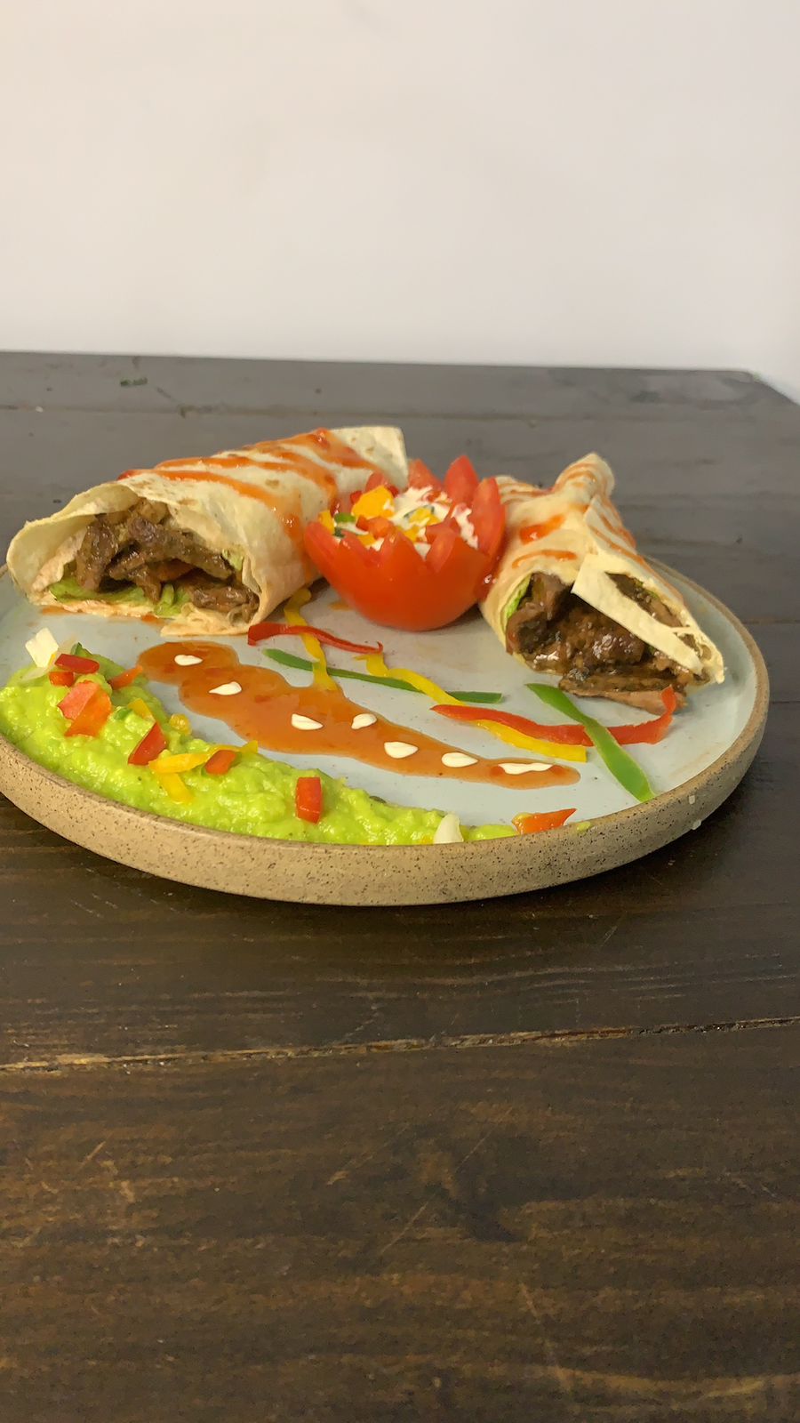 Tortilla de harina de trigo enrrollada con carne de res, cerdo o pollo, verduras, frijoles, acompañado salsa de la casa.