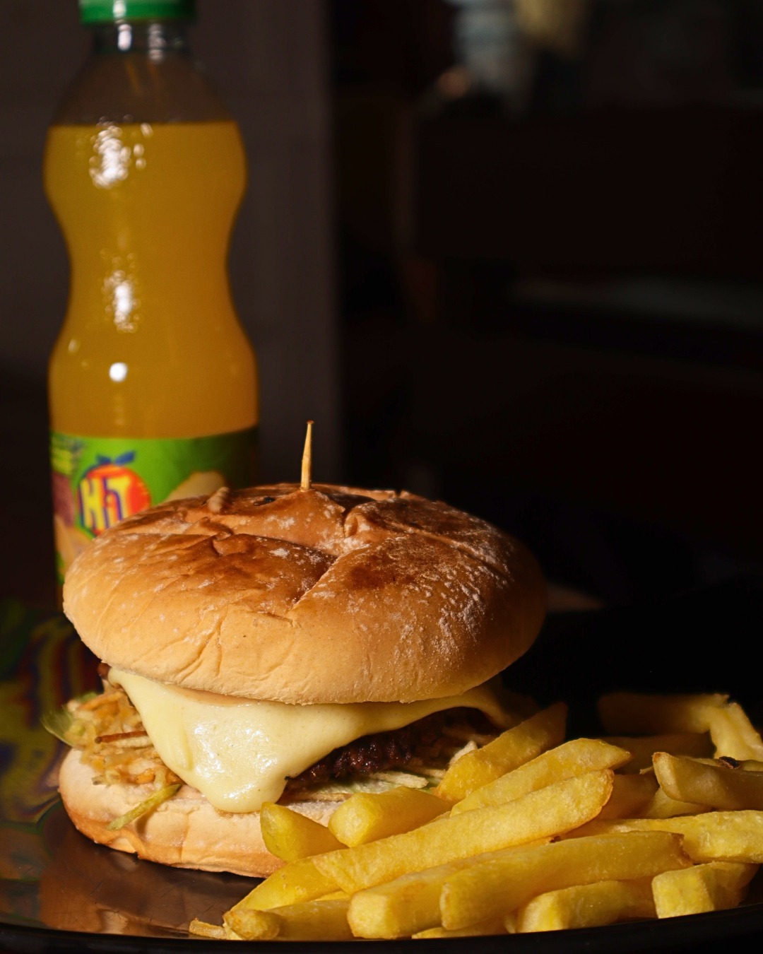Hamburguesa Sencilla: Pan bimbo artesanal, 100g de carne, queso doble crema, jamón, lechuga, tomate y salsa, Acompañada de Papas a la Francesa y Jugo Hit 500ml