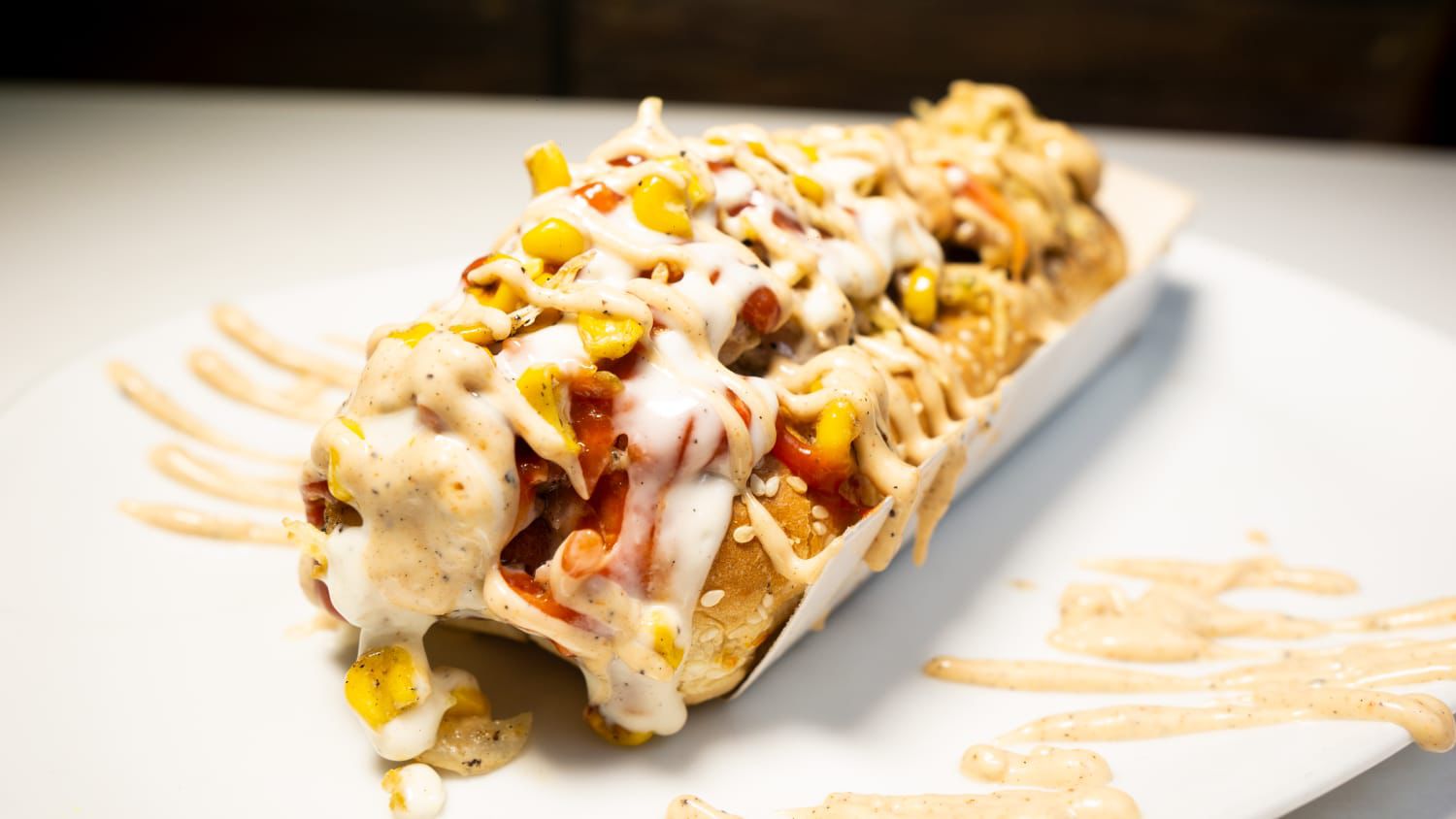 Saborea un Pan Bimbo relleno de salchicha americana y un picadillo delicioso de salchicha americana en trozos pequeños, maiz, queso fundido, lleva tocineta encima del picadillo Servido con papas ripio y nuestras salsas especiales de la casa.(platillo personal)