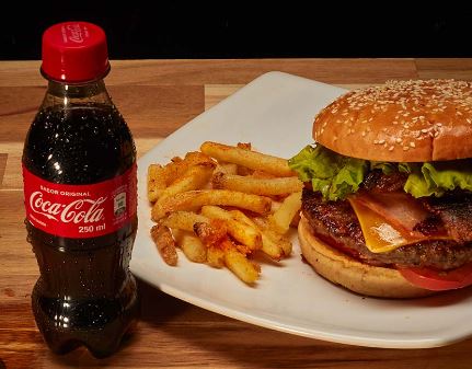Hamburguesa Sencilla, Pan bimbo artesanal, 100g de carne, queso doble crema, jamón, lechuga, tomate y salsa + Papas a la Francesa 70 g aproximadamente + Gaseosa Coca-Cola Sabor Original 250 ml