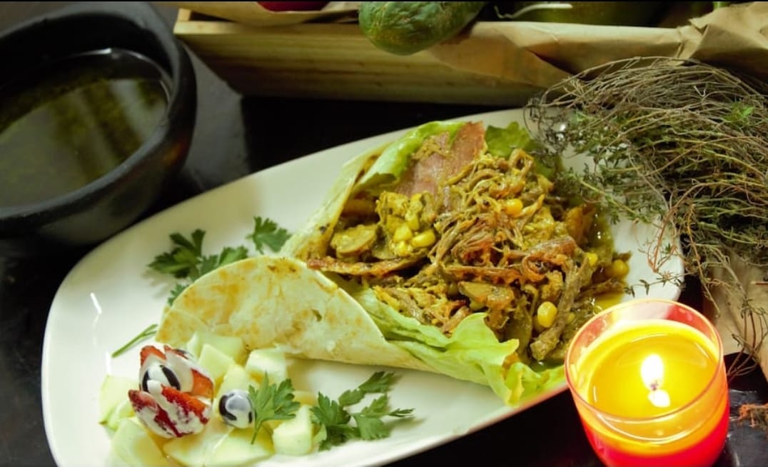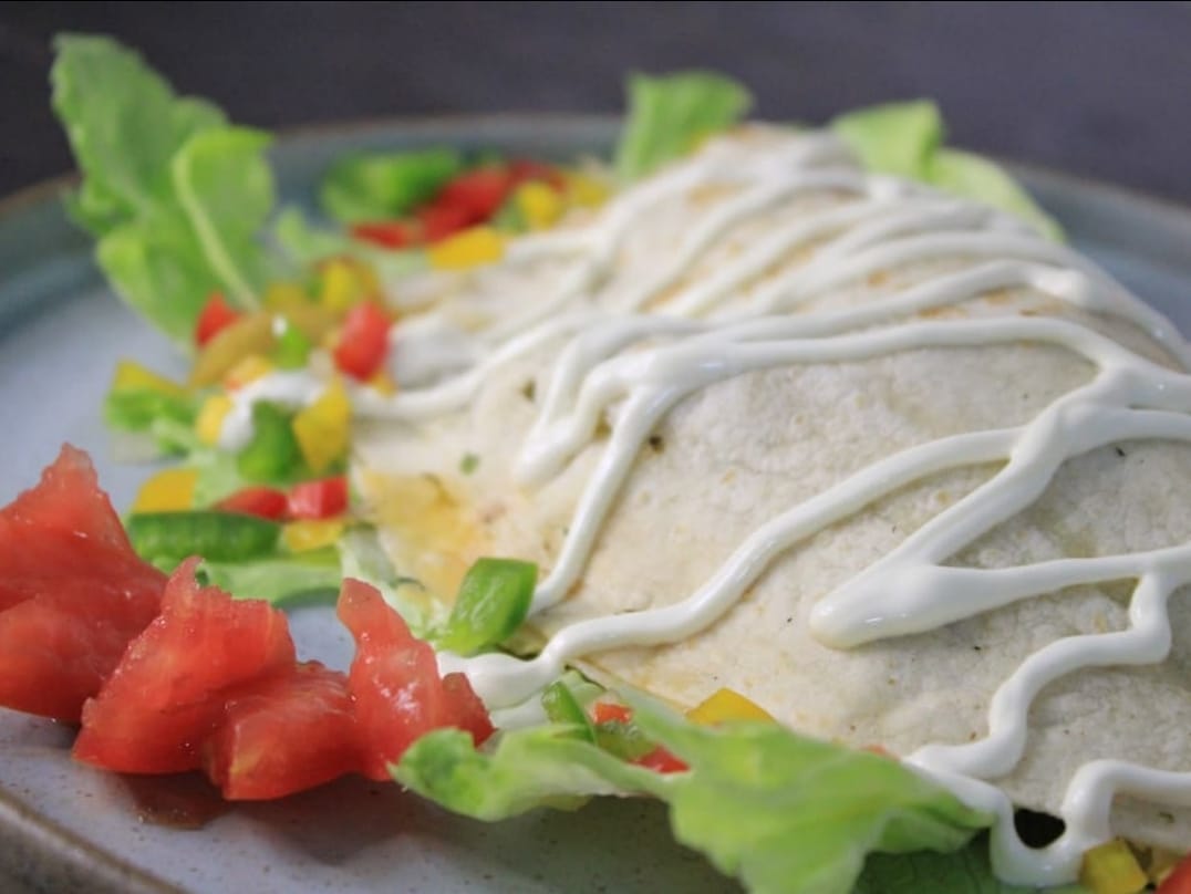 Tortilla de maíz doblada por la mitad, rellena de queso, trozos de pollo, carne, verduras y salsa de la casa.